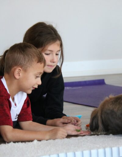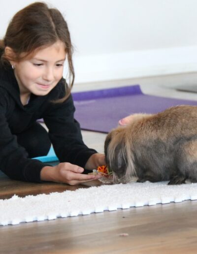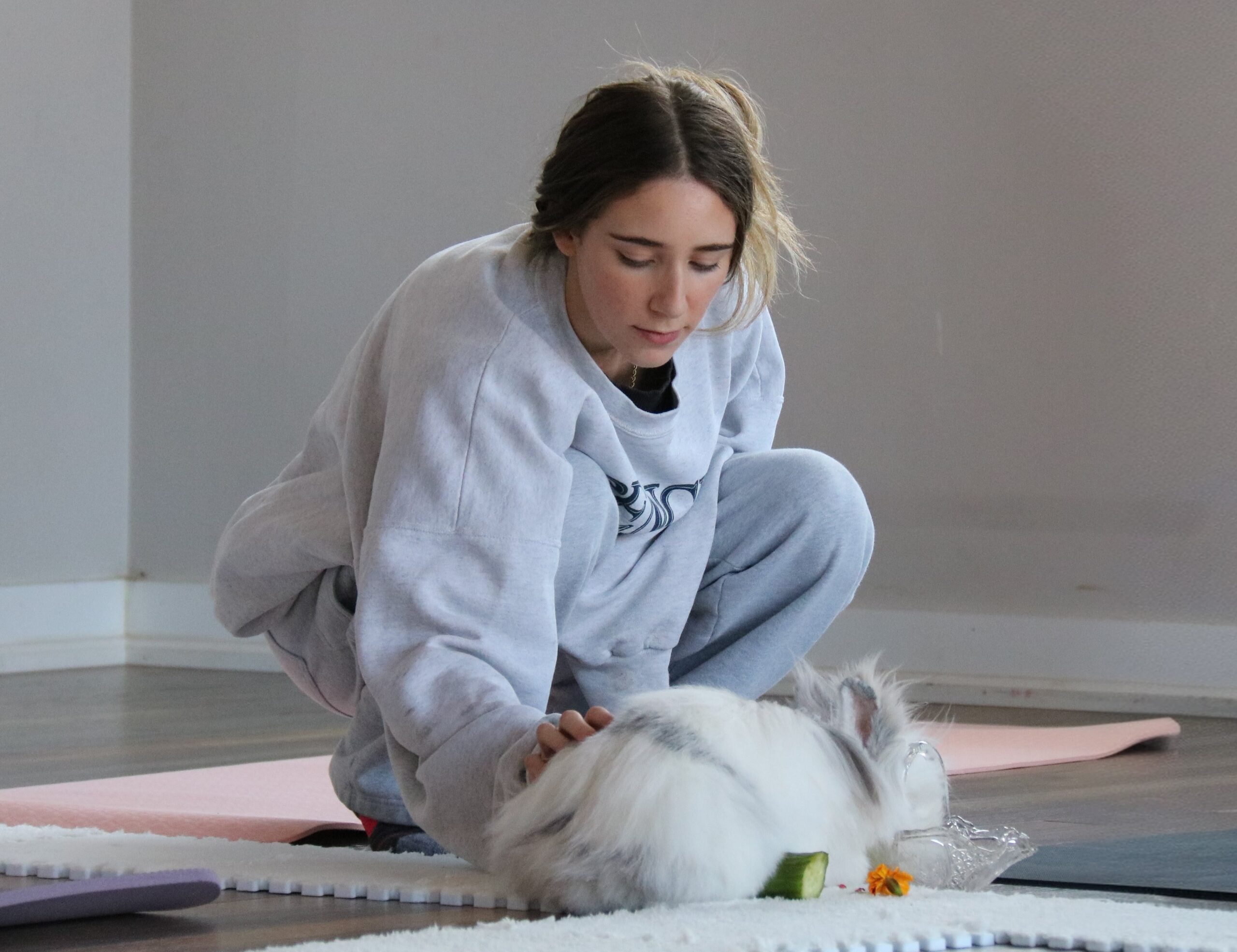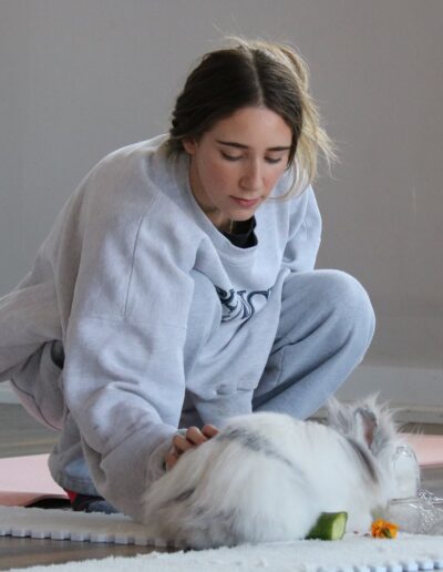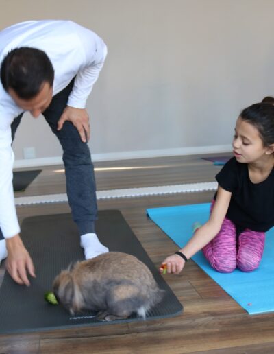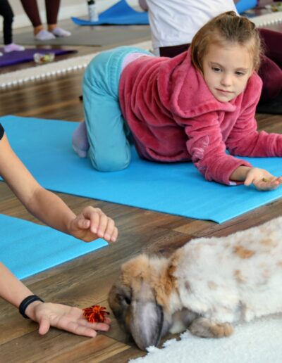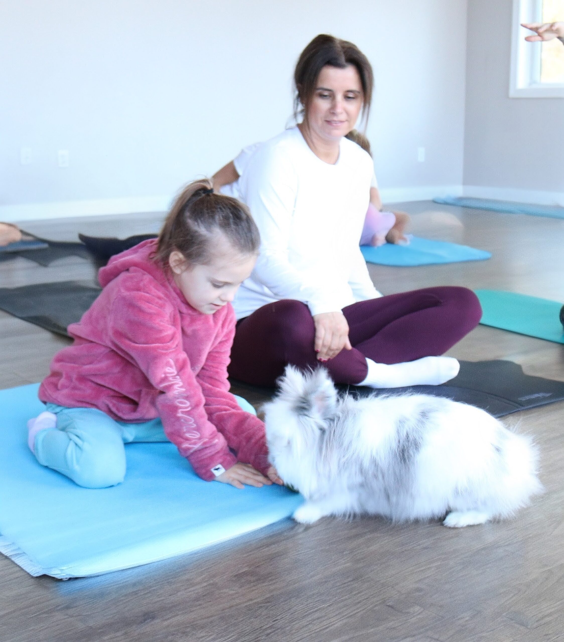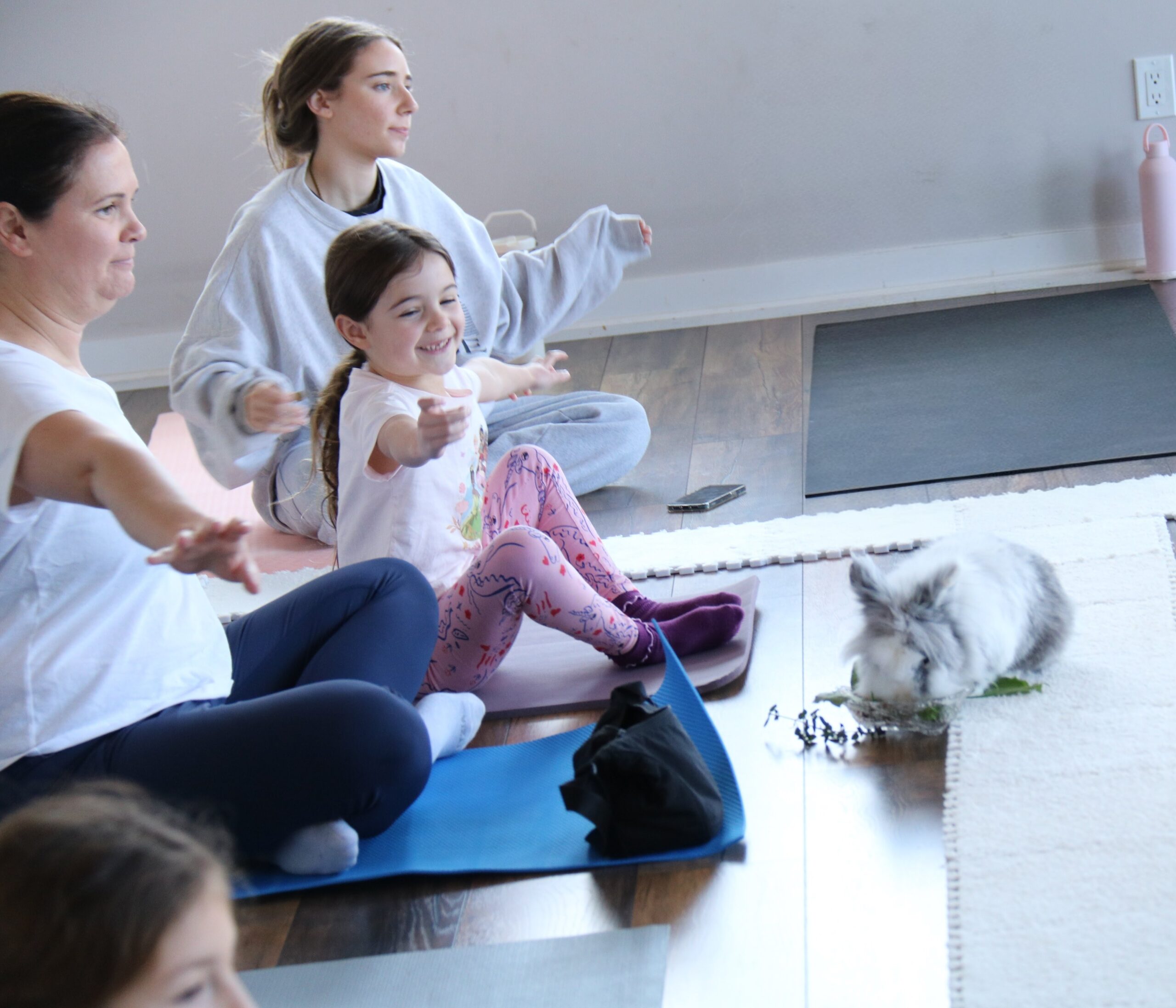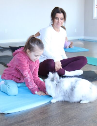 Throughout the session, our bunnies quietly explore the space. They may hop past yoga mats, stretch out nearby, or pause to observe the group. Because rabbits are sensitive prey animals, the experience works best when the atmosphere stays gentle and relaxed. Many families find that simply noticing the bunnies’ calm presence naturally helps everyone slow down.